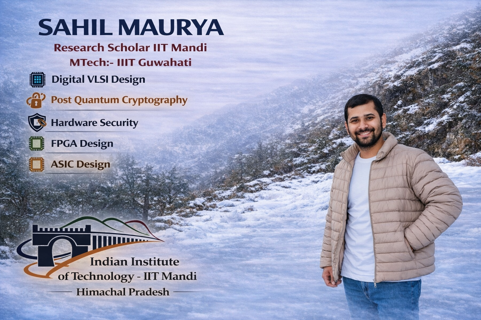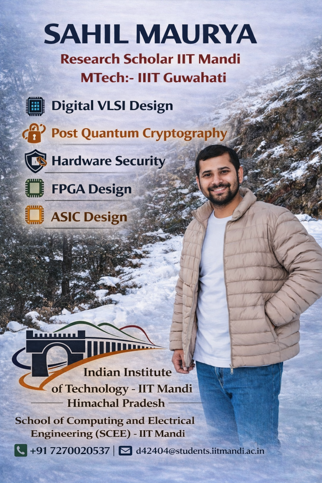 Hello and welcome to my profile! I'm Sahil Maurya, currently a Research Scholar at the School of Computing & Electrical Engineering (SCEE), IIT Mandi. I am a VLSI and Hardware Security researcher, specializing in Post-Quantum Cryptography (PQC) Hardware Acceleration, Secure RISC-V SoC Architectures, Digital VLSI Design, and FPGA/ASIC Implementation.